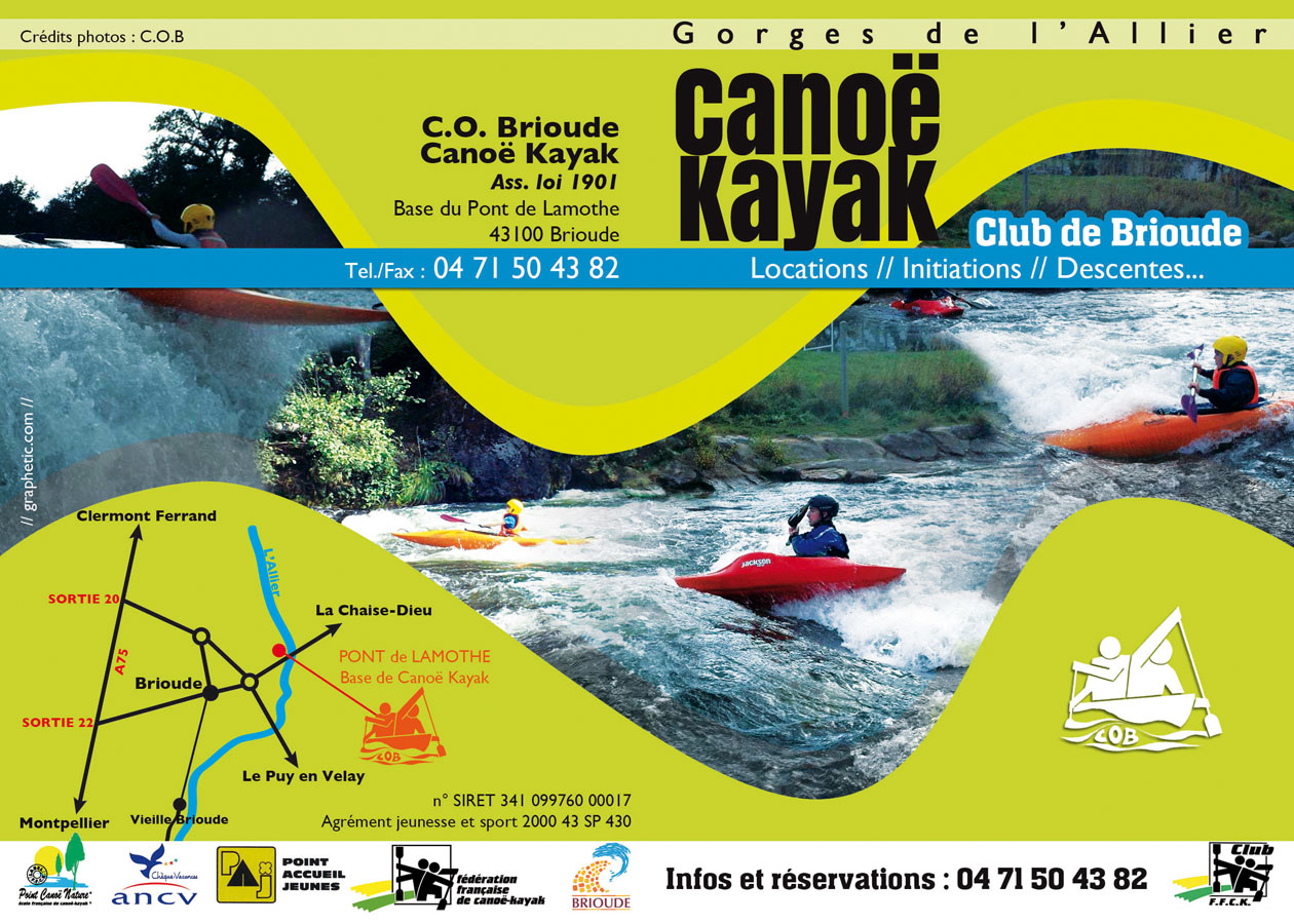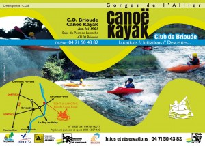 Club canoë kayak de Brioude A imprimer Conception et impression des visuels pour la saison estival du COB (Locations de canoë et de kayak du club de Brioude). Affiche vitrine 20×42 Flyers A5