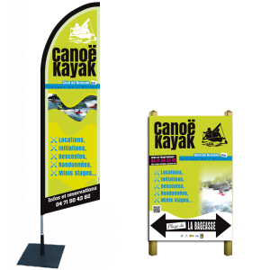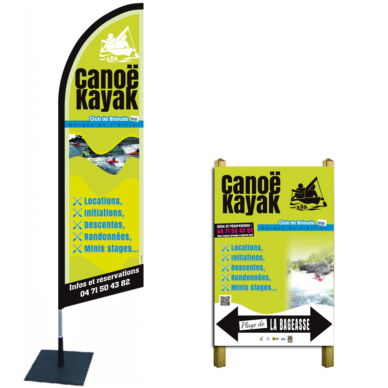 Drapeau plume et panneau pvc COB A imprimer, Divers Réalisation et fabrication pour le club de kayak de Brioude : – drapeaux forme aile 192 x 57 – panneau pvc 3,5mm 80 x 120