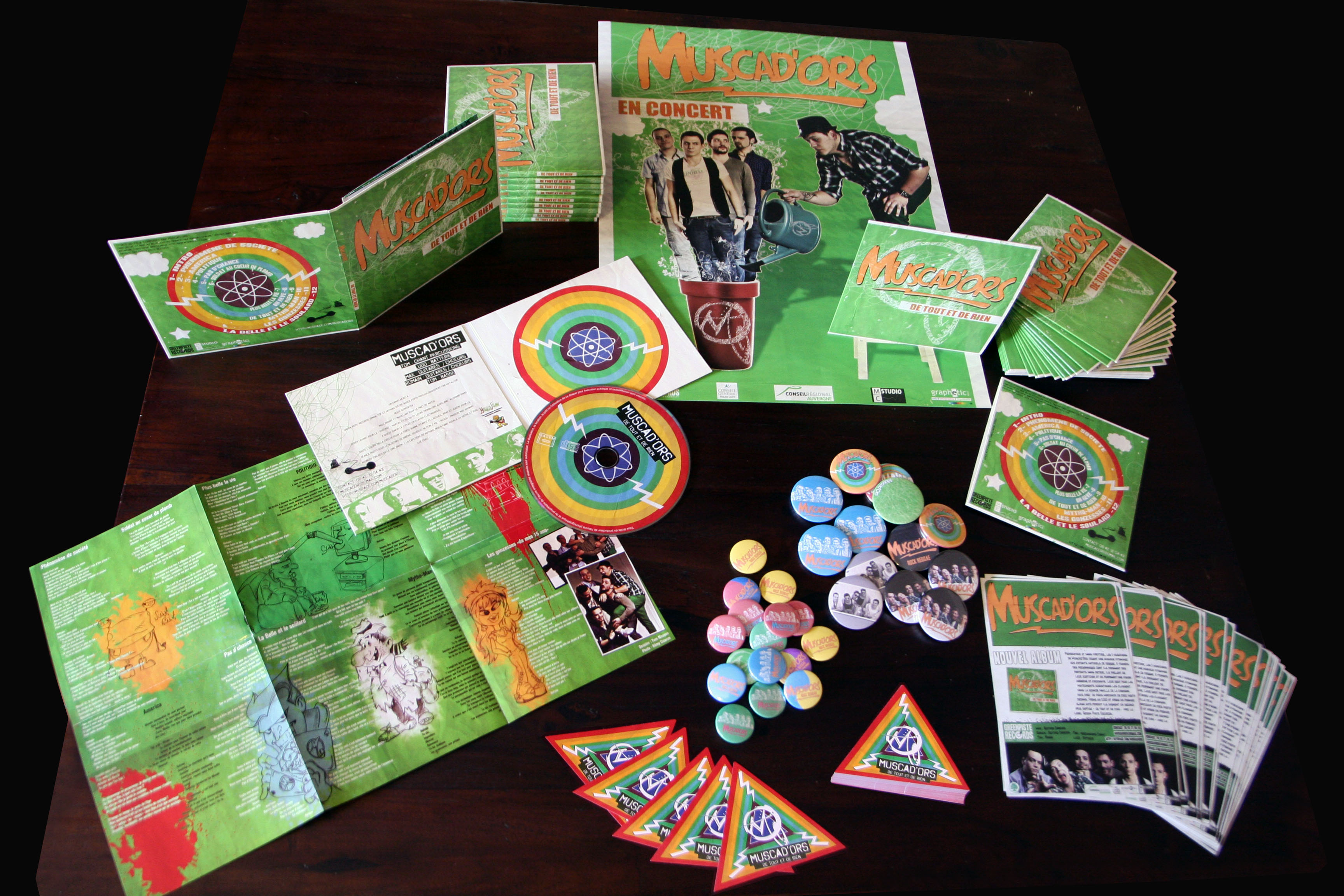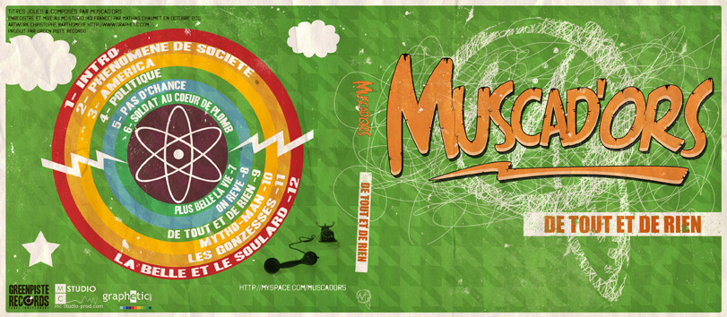 Groupe Muscad’Ors A imprimer, Divers Conception et fabrication des outils du groupe de musique Muscad’Ors : Disques albums et promotionnels, Flyers, Affiches, Badges, Stickers. Rôle de graphetic : ★ Design ★ Impression des supports ★ Fabrication des badges