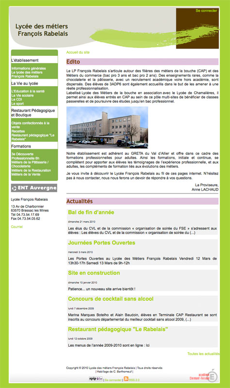 Lycée François Rabelais Sites internet Conception du site du Lycée professionnel François Rabelais. Site autogéré sur une base spip. http://www3.ac-clermont.fr/etabliss/lycee-rabelais-brassac/