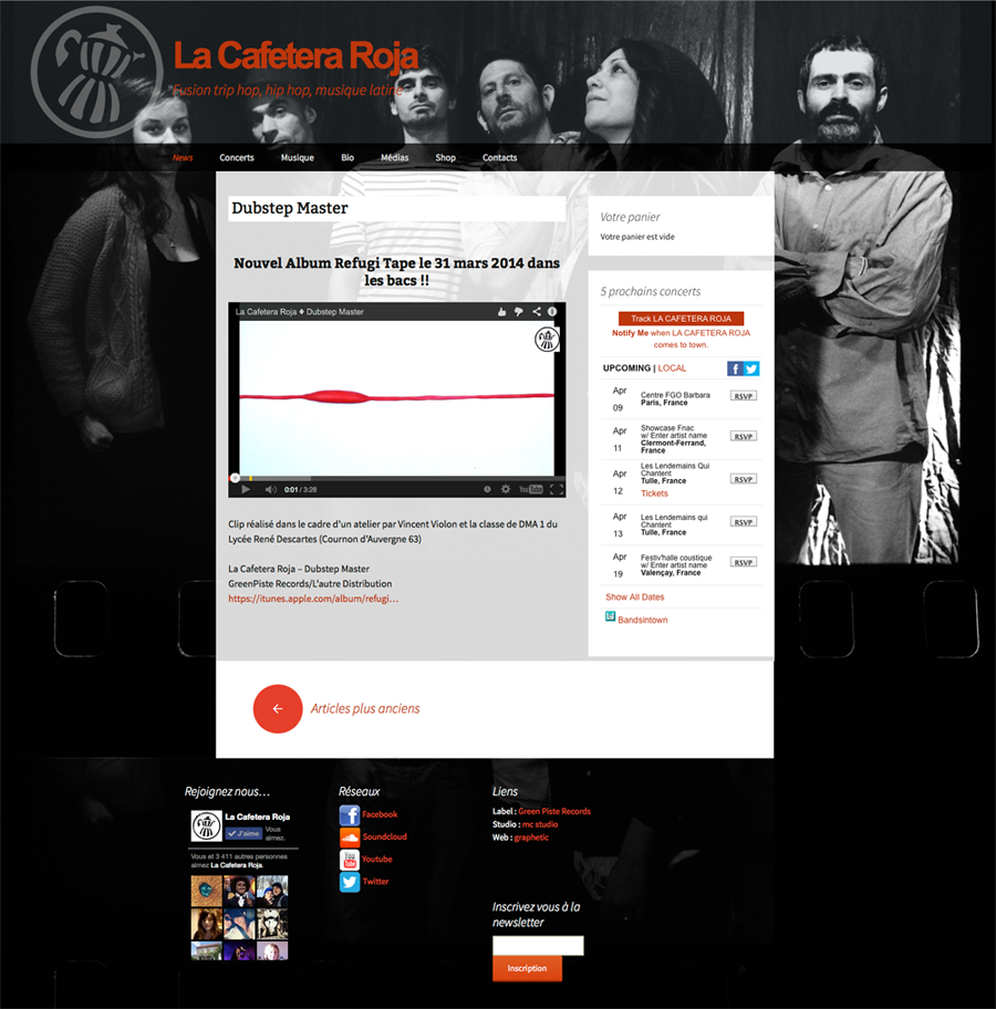 Site responsive design système de vente en ligne, palyer musique, intégration réseau bandsintown, Facebook, remonté et intégration de chaine et playlist youtube.